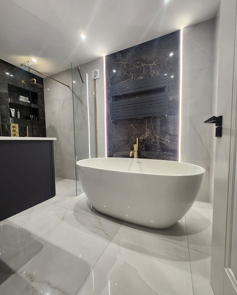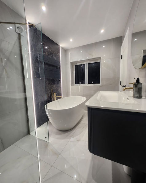 This modern bathroom radiates luxury through a refined colour scheme. A pristine white freestanding bathtub anchors the space, complemented by a floating vanity in a striking black finish with a white countertop. Subtle soft grey marble tiles with delicate veining cover the walls and floor, while warm golden accents add a touch of opulence. Ambient recessed lighting completes the serene, inviting retreat.