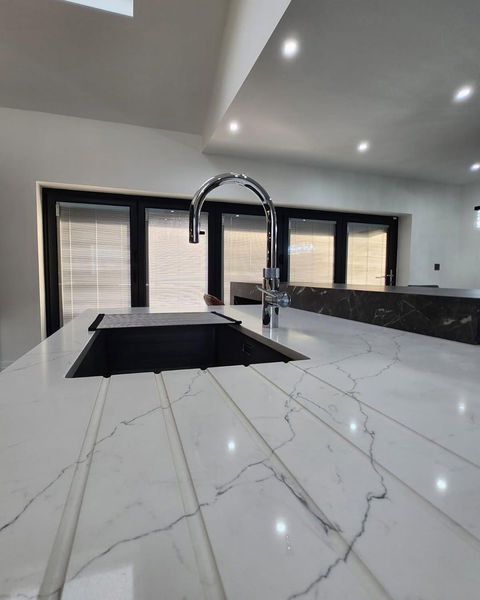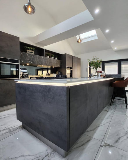 Bold Elegance: Modern Kitchen in Deep Hues & Marble Accents